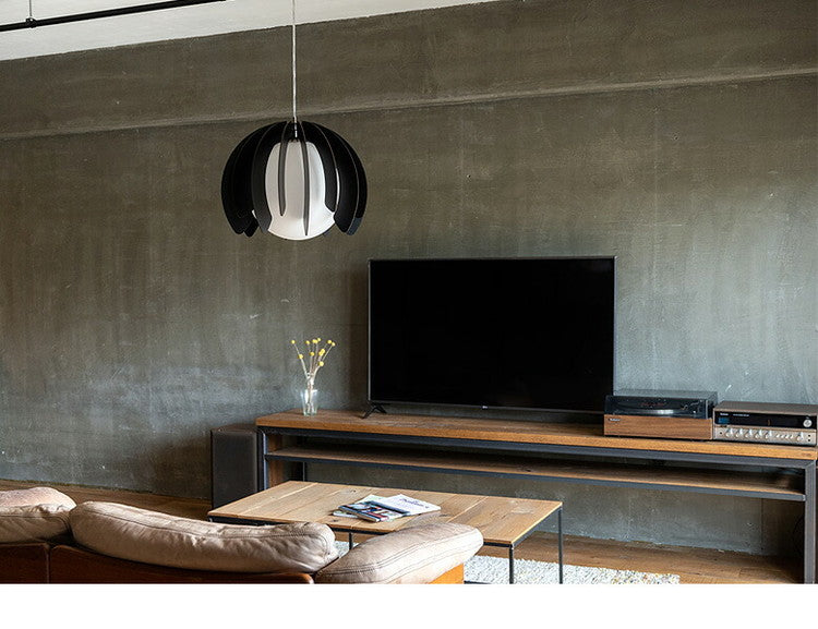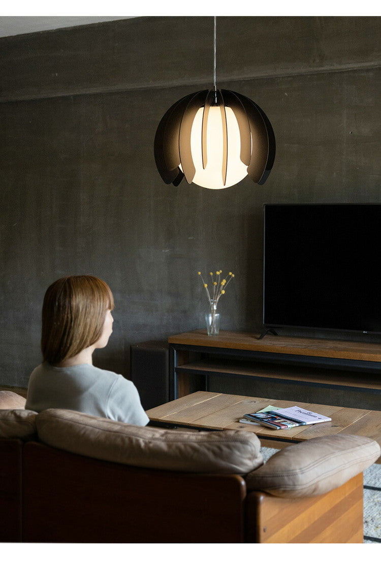 球形のオパールガラスを木材で包み込んだ複雑な構造が最大の特徴。