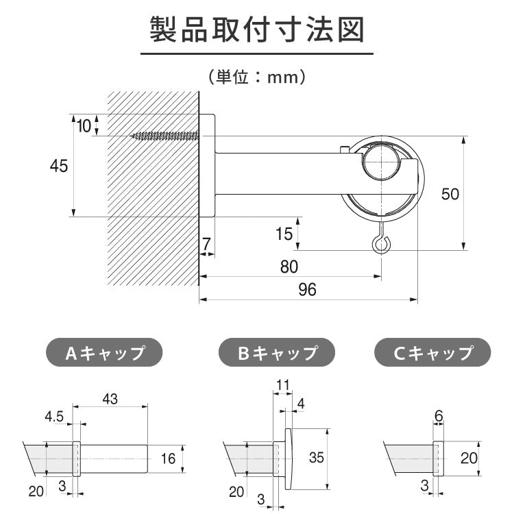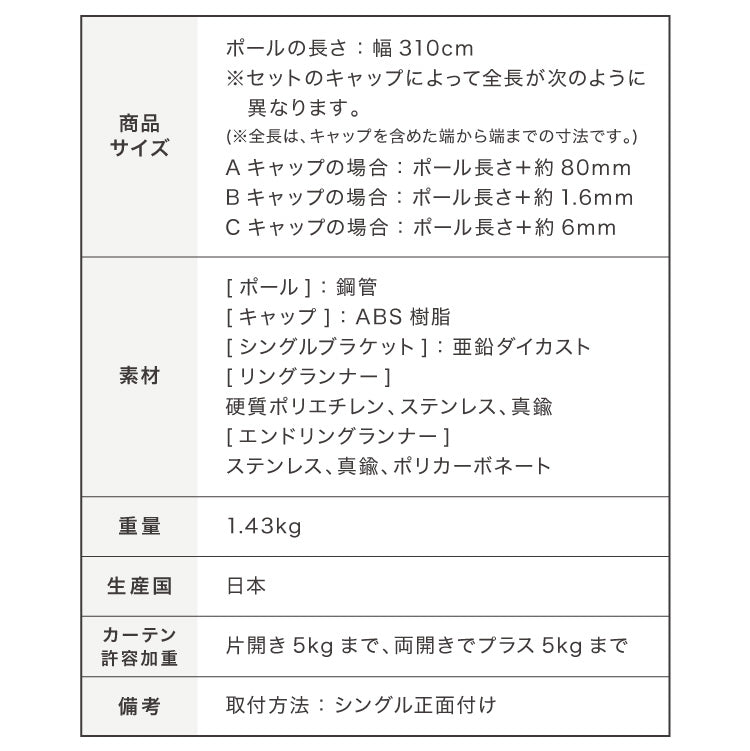 [ポール]:鋼管、[キャップ]:ABS樹脂、[シングルブラケット]:亜鉛ダイカスト、[Nダブルブラケット]:亜鉛ダイカスト、スチール、アセタール樹脂、[リングランナー]:真鍮、硬質ポリエチレン、ステンレス、[エンドリングランナー]:真鍮、ポリカーボネート、ステンレス